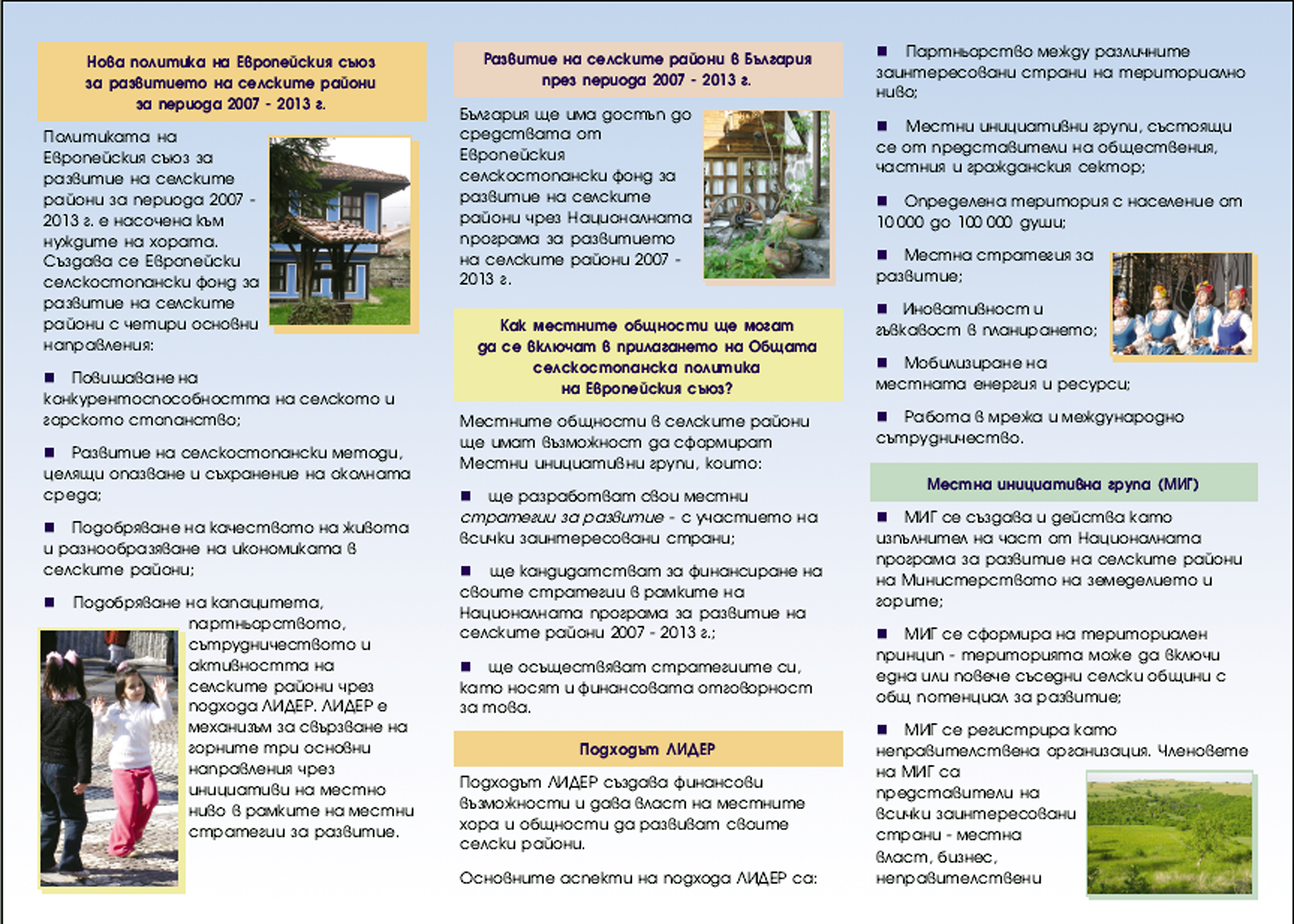 Политиката на Европейския съюз за развитие на селските райони за периода 2007 - 2013 г. е насочена към нуждите на хората. Създава се Европейски селскостопански фонд за развитие на селските райони с четири основни направления: